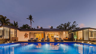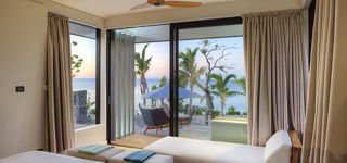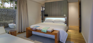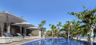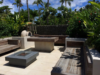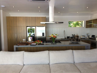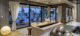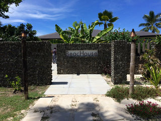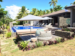 'BeacHouse' villa vomo islandThe 'BeacHouse' is located along the front edge of a large north facing site on Vomo Island, Fiji. The highly glazed front facade of the beach house is orientated due north to maximise the connectivity to the sea, beach and frontal dune. The floor plan is a series of bedroom nodes radiating out from the central living hub that has a distinct North/South axis to the beach. The central Living zone contains the lounge, kitchen and dining. The north face of the living space has full height glass stacking doors providing an expansive opening and indoor / outdoor flow to the large deck beyond. The generous external decks envelop the large infinity pool beyond, the pools infinity edge blur's the boundaries between the pool and the ocean beyond. The main large deck contains an outdoor BBQ zone and covered dining recess. The decking continues and tiers down to the west of the pool to a sunken lounge zones. Either side of the main living portico are the bedroom spaces. To the rear of the BeacHouse a BOMA zone provide a sheltered retreat, with central fire, Teppanyakki Grille and cooling mist fans. The overall design is a contemporary take on a vernacular Fijian beach Buree. The palate of materials is crisp, clean and modern and offset with local natural vernacular materials. Local volcanic rock wall element are juxtaposed against natural crisply plaster rendered external walls and white square stopped internal walls. Random width & depth cedar external /internal vertical cladding provide warmth and tactility. |